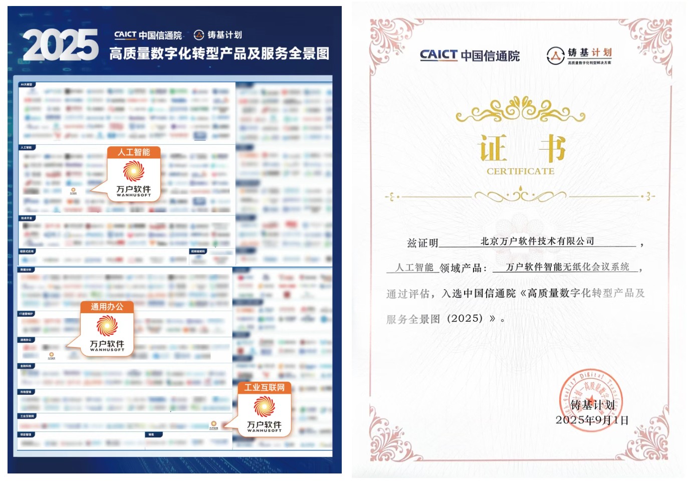 作為值得信賴的數智化協同運營專家,萬戶軟件憑借在人工智能、通用辦公、工業互聯網領域的卓越表現,在1000余家企業中脫穎而出,入選2025年上半年度“全景圖”,產品實力與創新能力獲國家級權威機構認證。
