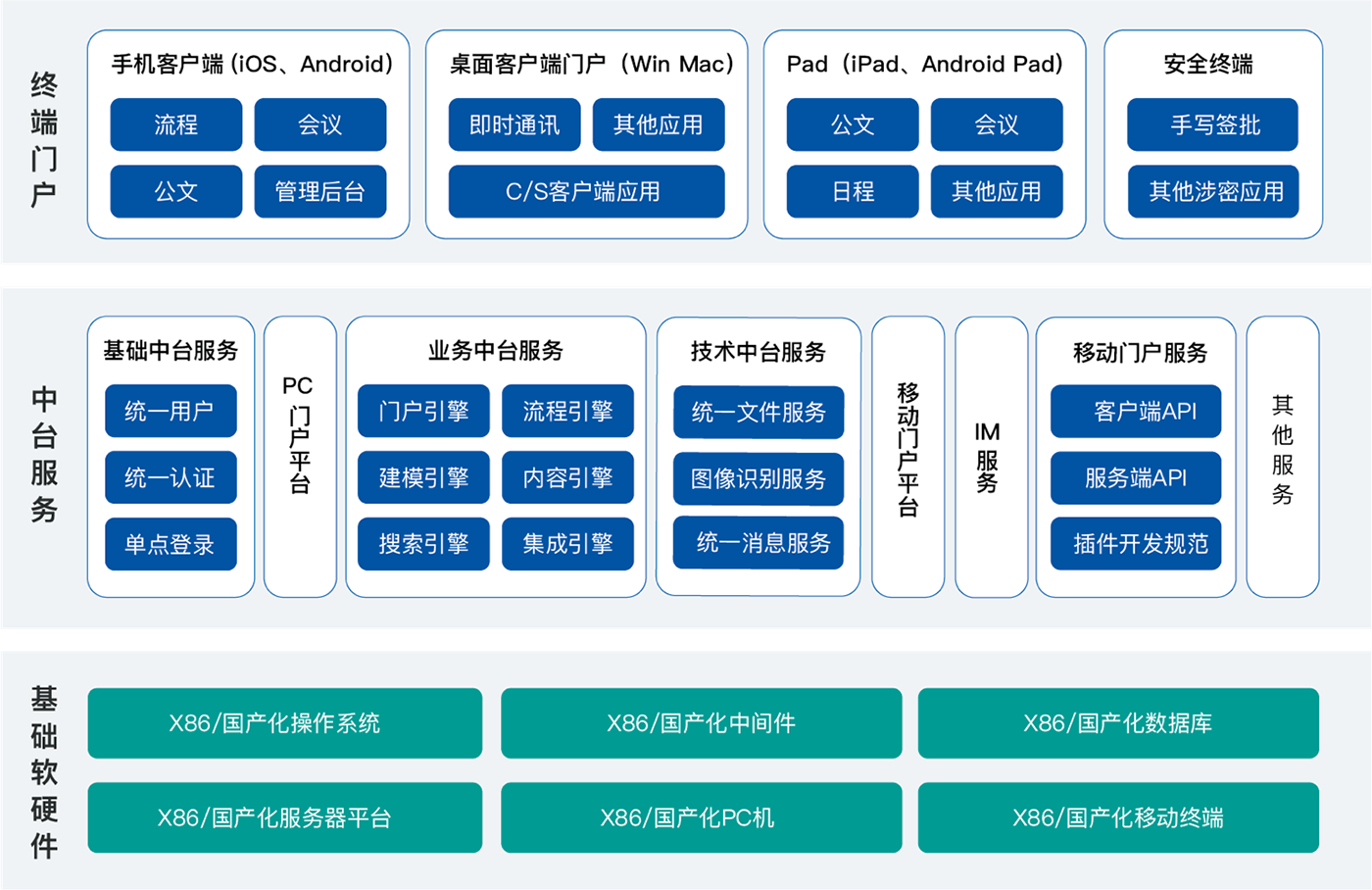 提供業務應用接入、業務應用分級分權管理、運營、統一入口、統一用戶、統一認證、統一待辦、統一消息提醒等綜合協同辦公服務。